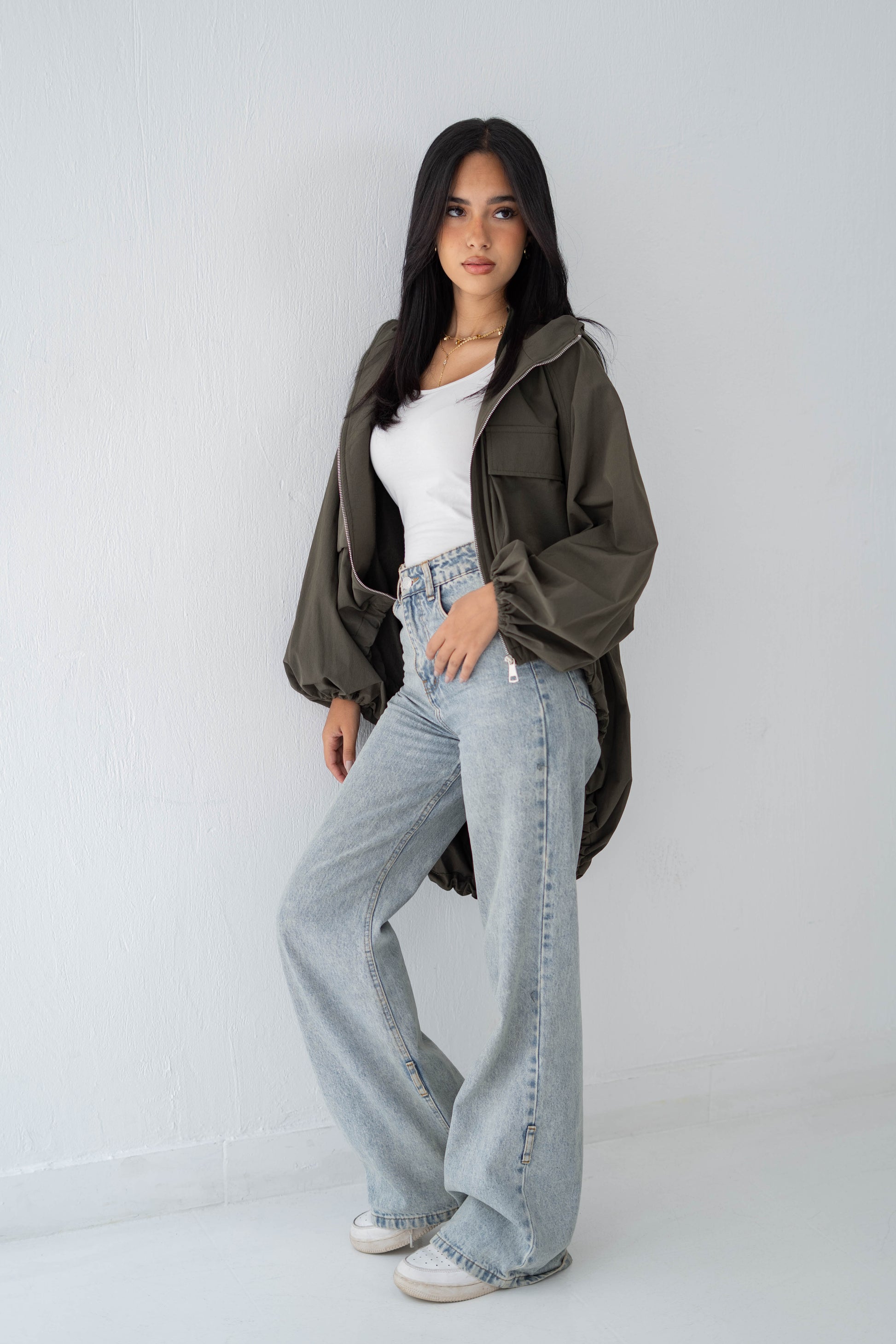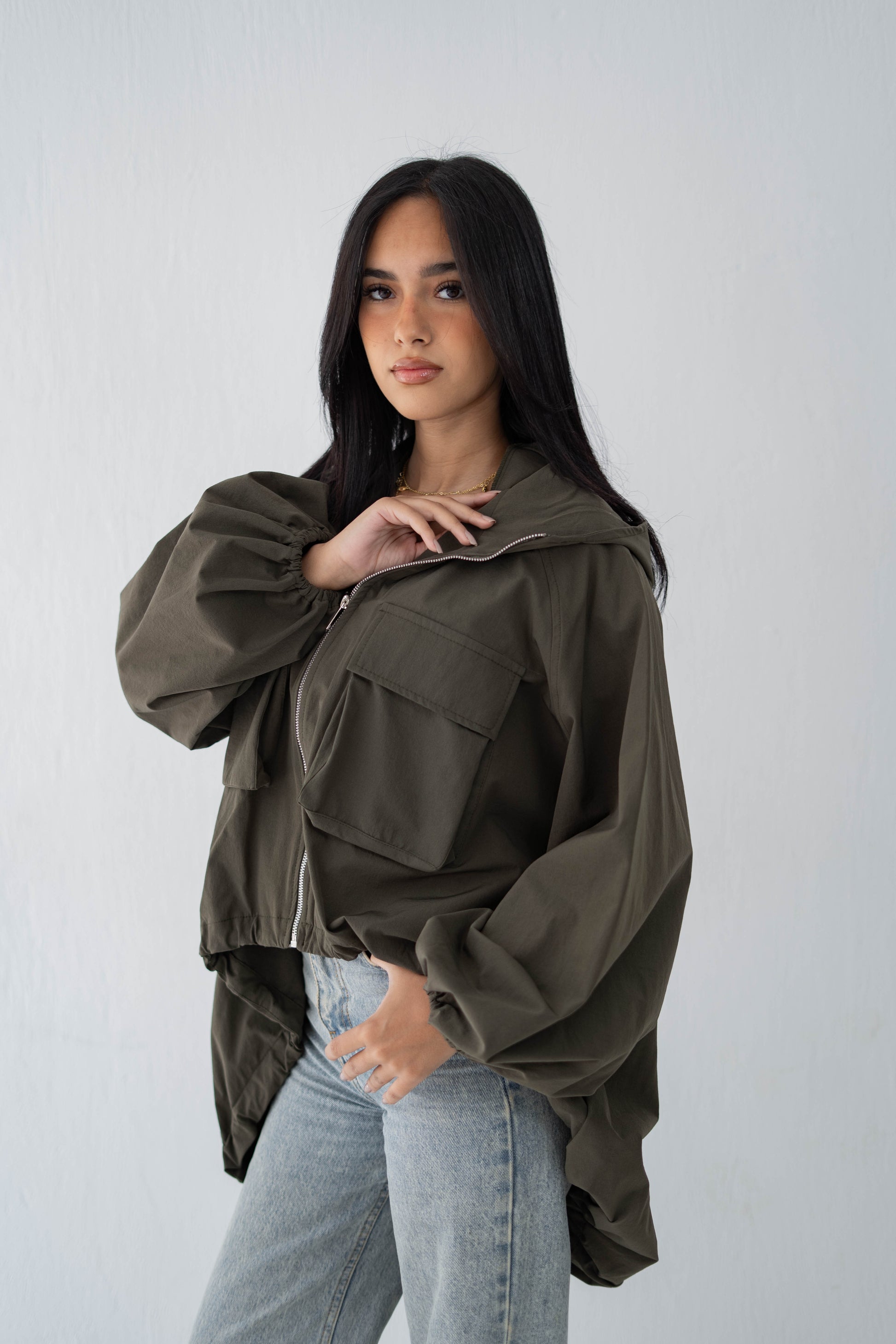 Effortlessly cool and versatile — this oversized utility zip jacket features bold flap pockets, elastic cuffs, and a high-low hem for a modern twist. Lightweight, comfy, and perfect for layering