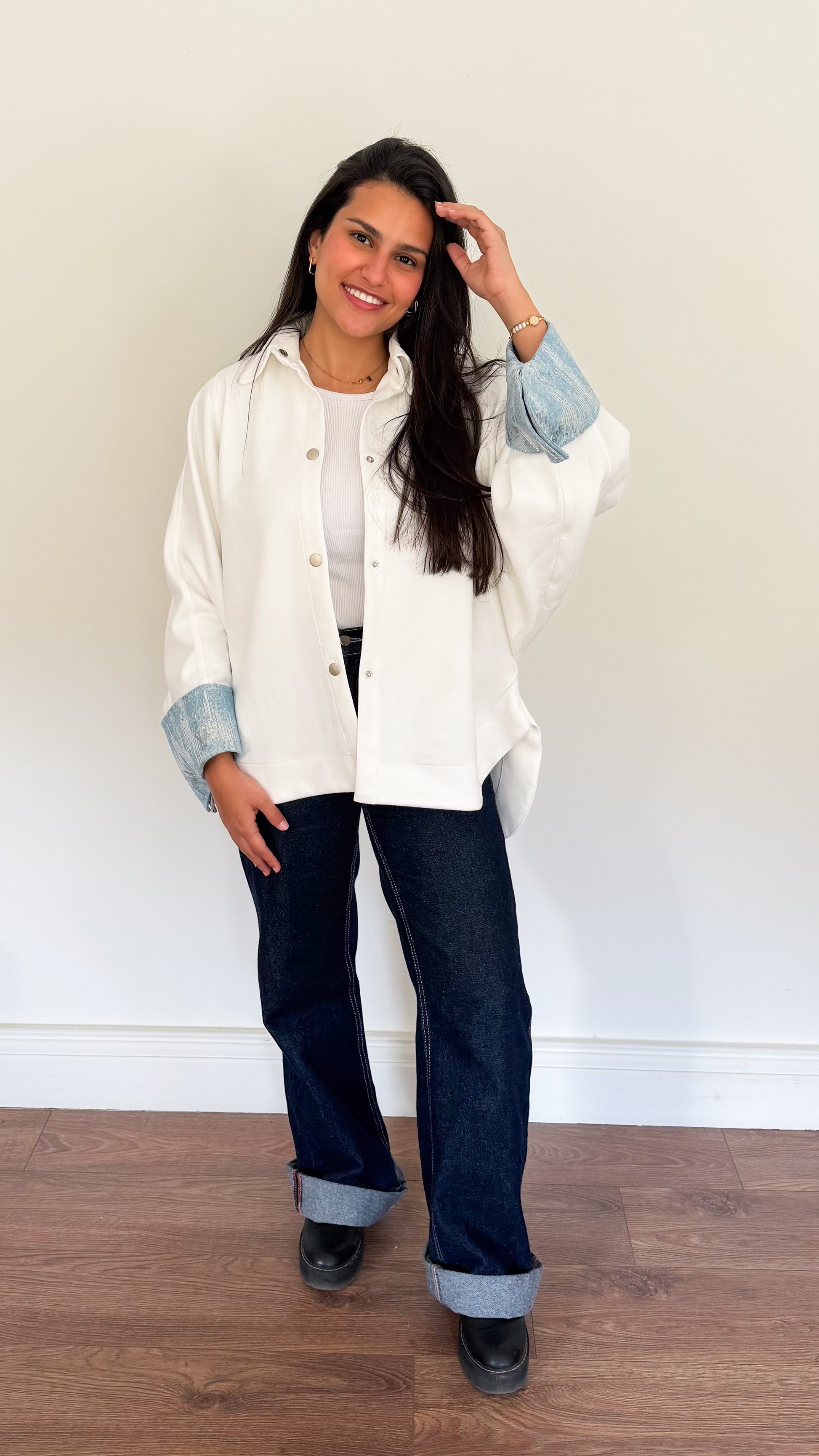 - Denim cuff accents for a modern touch