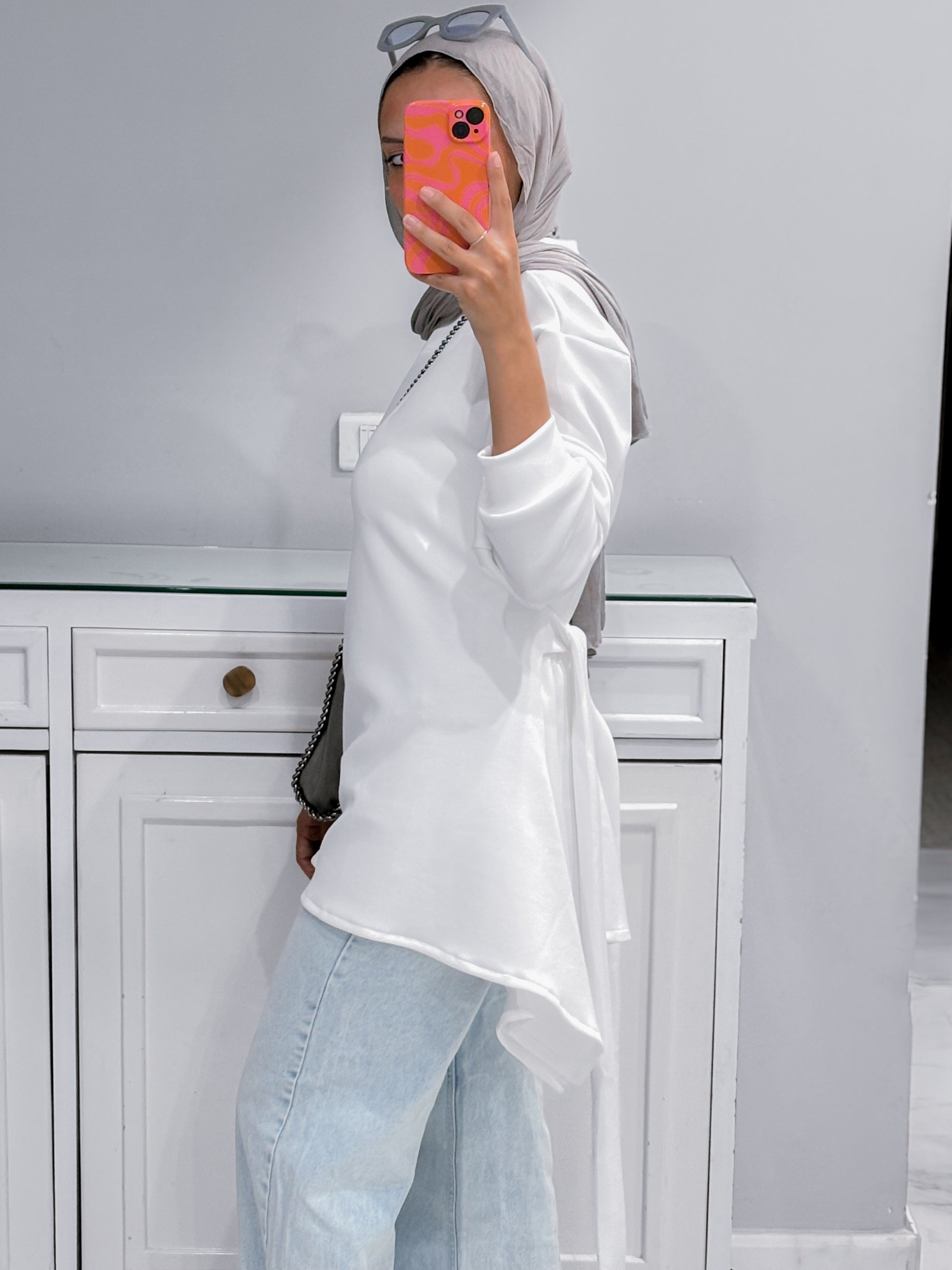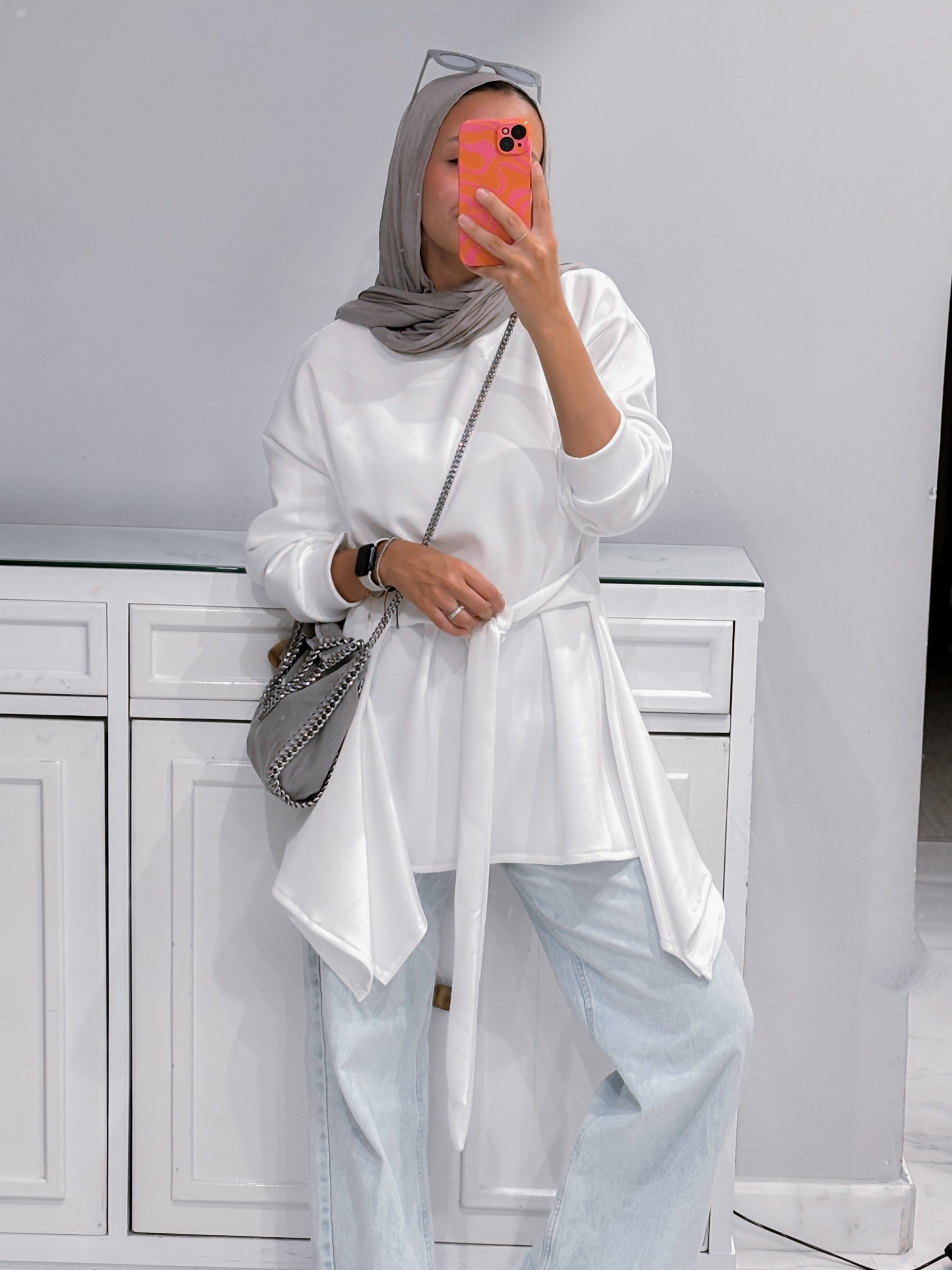 Effortlessly elegant, this wrap-style top flatters every shape with its soft drape and adjustable waist tie. Crafted from premium interlock fabric, it gives you that cozy-yet-polished look for any day, any plan.
